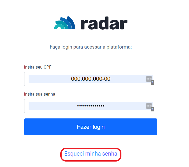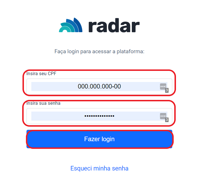 Acesse o Radar com o seu CPF e sua senha e clique em “Fazer Login”