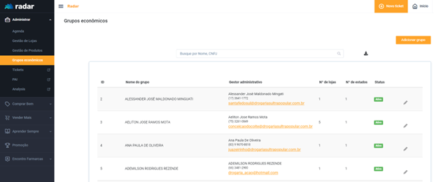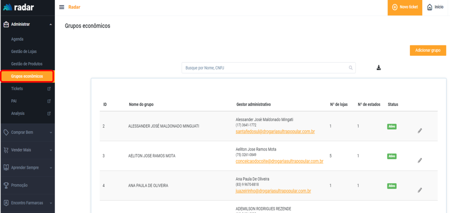 Será exibida a tela com todos os grupos econômicos já cadastrados e gestor administrativo de cada um dos grupos