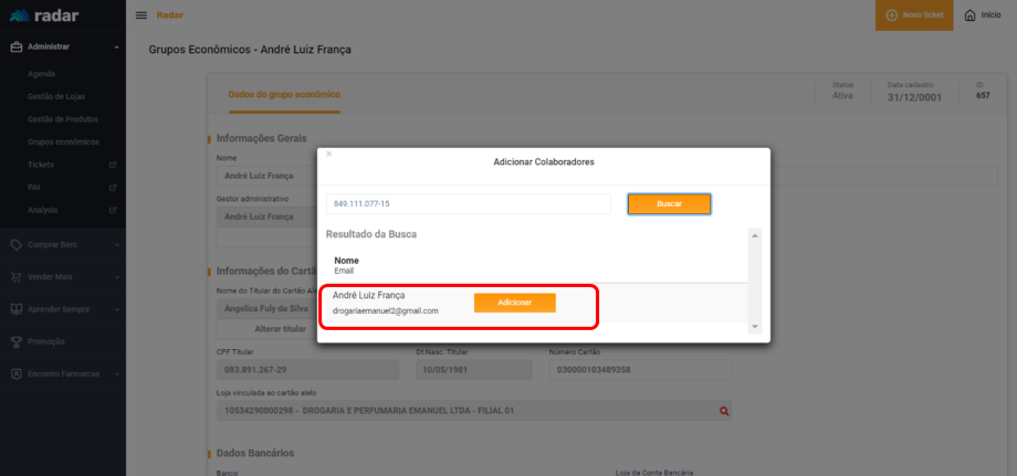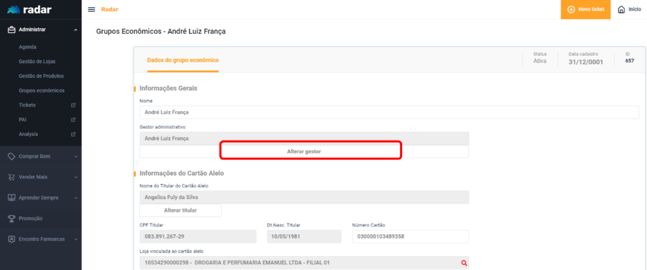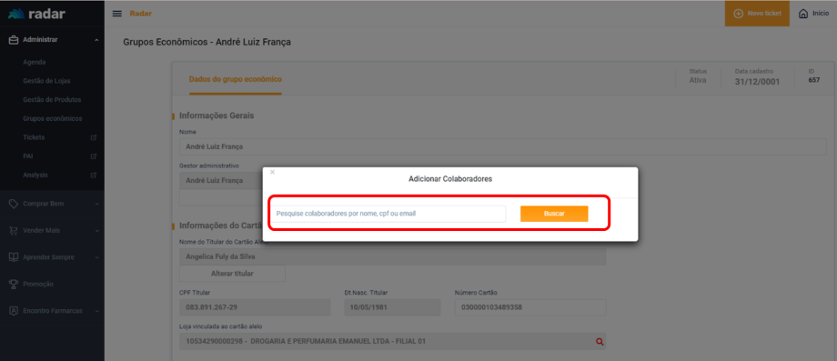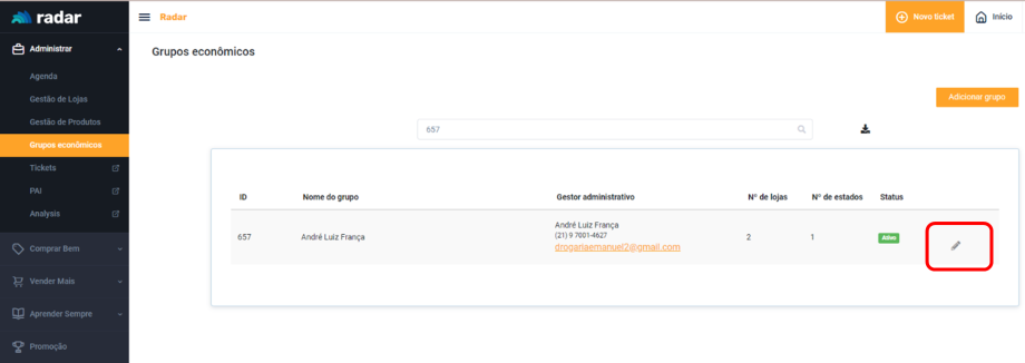 Para realizar a alteração, Cadastro deve acessar o Radar e ir até o campo Grupos Econômicos