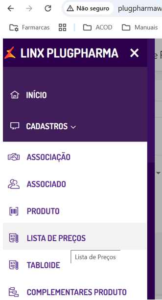 1. Acesso ao Plugpharma > Associado > Insira o CNPJ da loja > Integração > Gerenciado por lista de preços > Número da lista.
