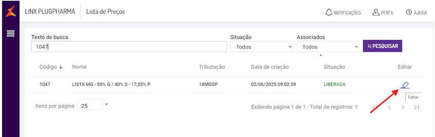 3. Em Texto de busca, digite o número da lista localizada e clique em editar: