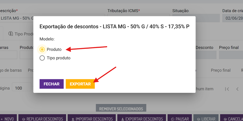 4. Agora, clique em “Exportar Descontos” > Selecione o modelo “Produto” e clique em “Exportar”: