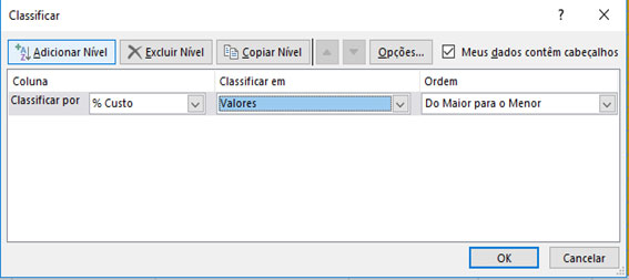 – Classificar por: % Custo > Classificar em: Valores > Ordem: do maior para o menor