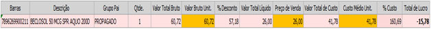Apenas uma unidade do produto foi vendida durante o período verificado, o preço de custo para que a loja adquirisse o produto foi de R$ 41,78, e seu PMC R$ 60,72. Foi aplicado desconto de 57,18% sobre o PMC do produto, o que é considerado um alto desconto por se tratar de um medicamento Propagado e que está bem acima da lista de descontos mais agressiva da Ultra Popular, fazendo com que seu valor de revenda caísse para R$ 26,00, valor bem abaixo do pago por ele. Causando um prejuízo de R$ 15,78 por produto vendido.