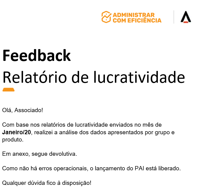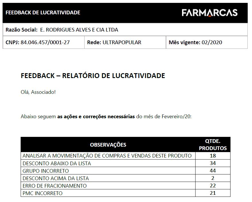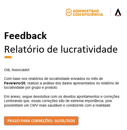 Recebemos dois relatórios, sendo o primeiro o relatório de lucratividade por grupo e o segundo o relatório de lucratividade por produto. Ambos são enviados pelo associado até o segundo dia útil de cada mês.