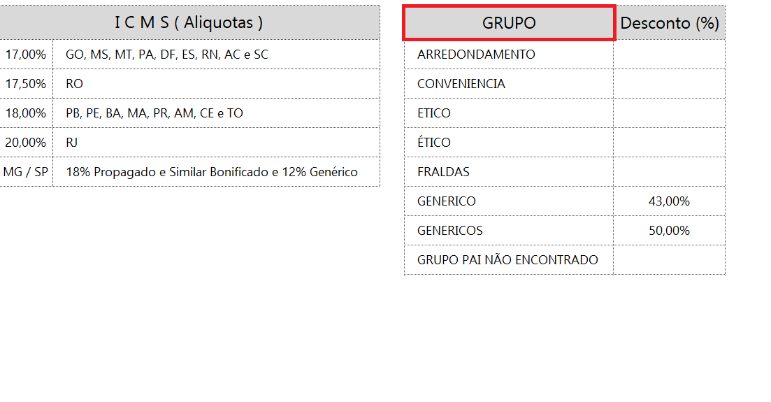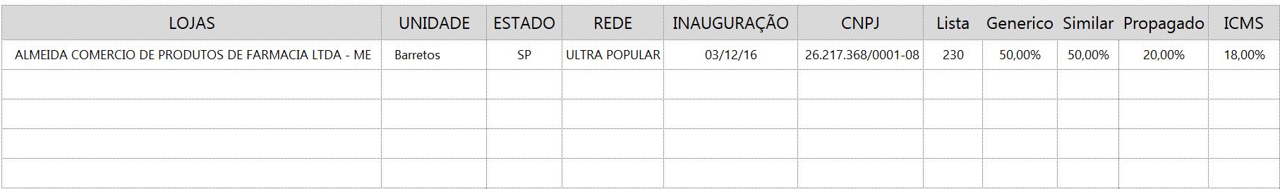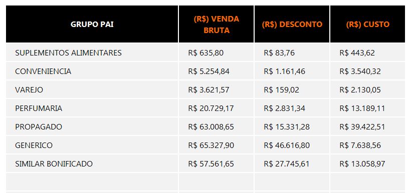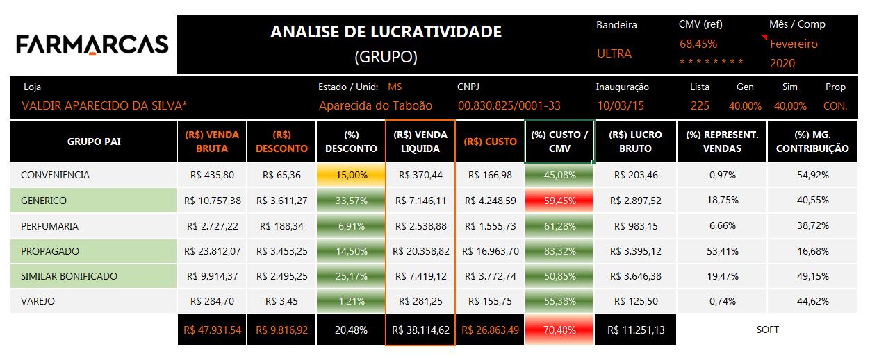 No caso dos descontos, ocorrerá a variação com base na lista praticada da farmácia (no caso das lojas POPULARES), já o CMV levará em conta os percentuais fixos da rede já mencionados anteriormente.
