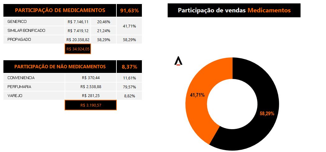 A participação de Medicamentos deve girar em pelo menos 65% da venda total. Desta fatia, pelo menos 50% deve ser de medicamentos Genéricos e Similares, para que a loja tenha lucratividade saudável.