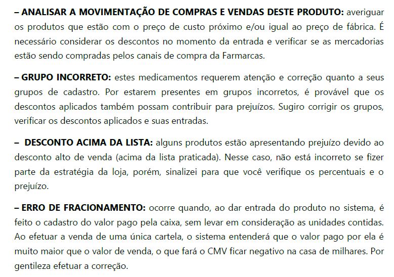– % de desconto representando prejuízo: caso o produto que não seja medicamento, ou que seja de precificação liberada apresente desconto alto, solicitar ao associado que verifique o cadastro de entrada. O prejuízo pode ser devido ao alto desconto atribuído ao produto como “combate”, ou pode-se tratar de erro de entrada por não ter sido considerado o desconto de compra do mesmo ao dar entrada na nota.