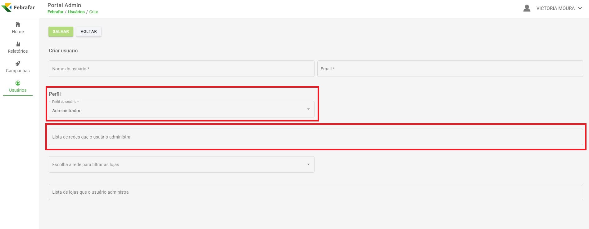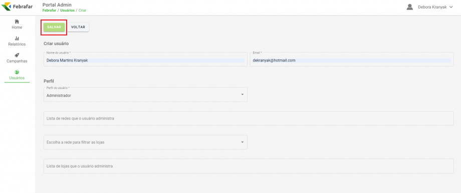 Clicando em novo usuário, todos os campos terão que ser preenchidos e para conseguir visualizar os dados estratégicos, o perfil terá que estar como administrador e na lista de redes que o usuário administra deverá selecionar todas as redes Farmarcas.