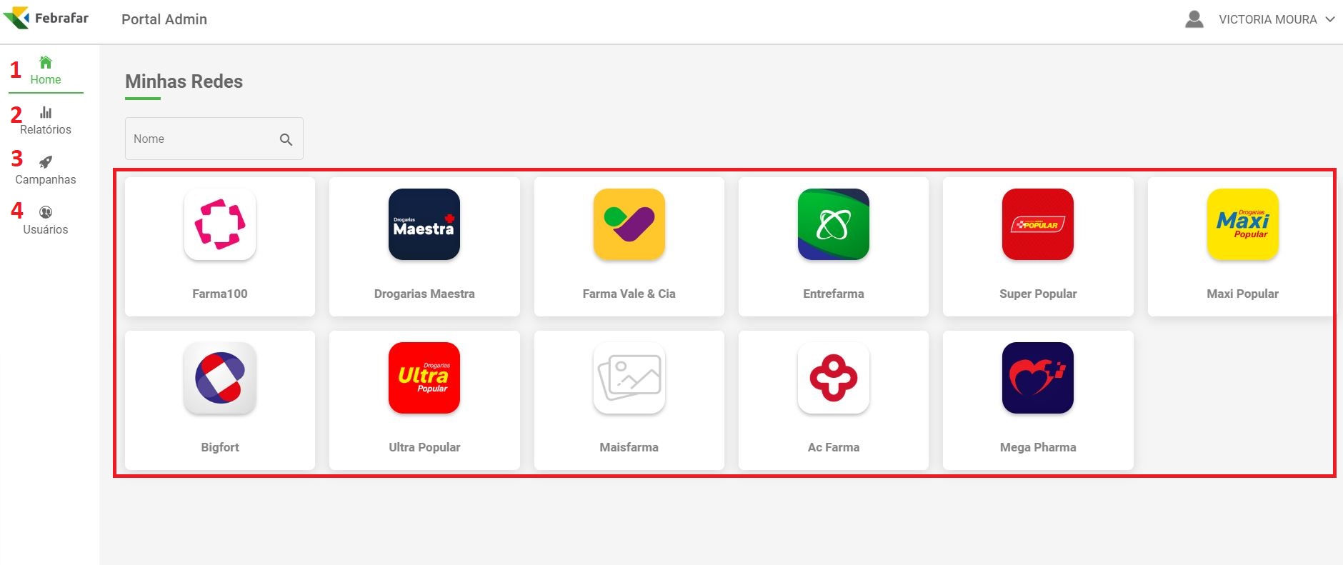 Na tela inicial encontram-se todas as redes que possuem o App na Farmarcas e algumas visões, tais como: