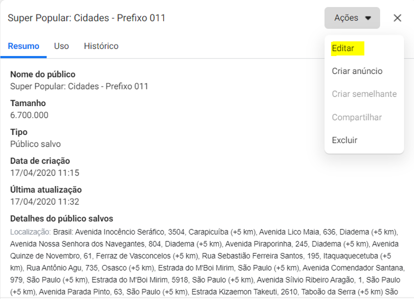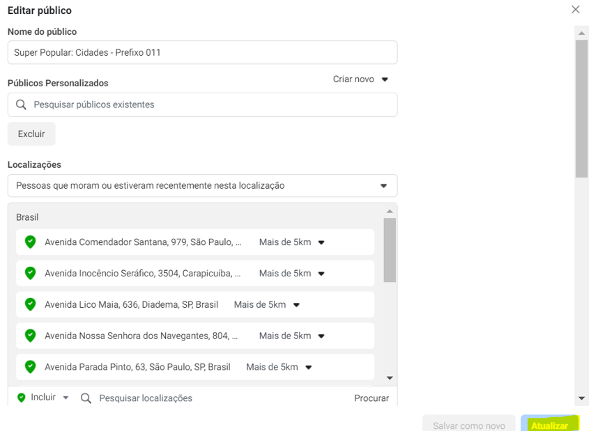 Adicionar o local ou interesse de segmentação desejado e clicar em “Atualizar