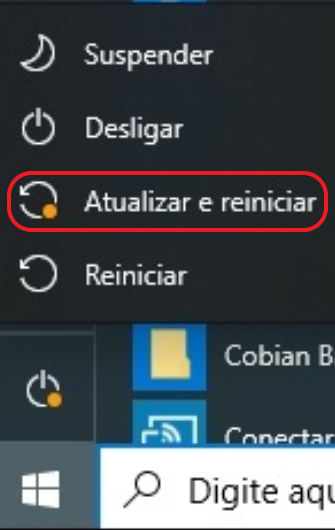 Após instalação, clicar no menu do windows em “Atualizar e reiniciar”