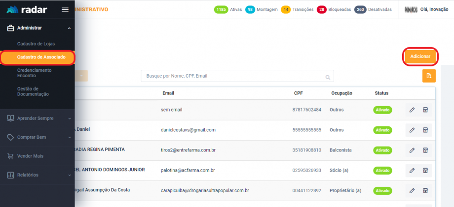 Dica: Antes de adicionar um novo associado, confirme se realmente já não está cadastrado