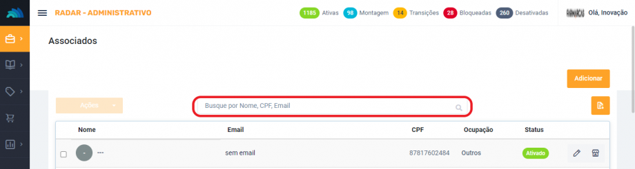 Digite o Nome, CPF ou E-mail do associado e clique na lupa para localizar cadastro