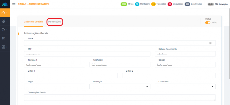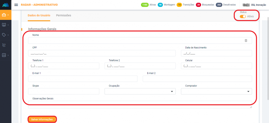 Preencha com os dados do usuário, mude o Status para “Ativa” e para finalizar clique em “Salvar Informações”
