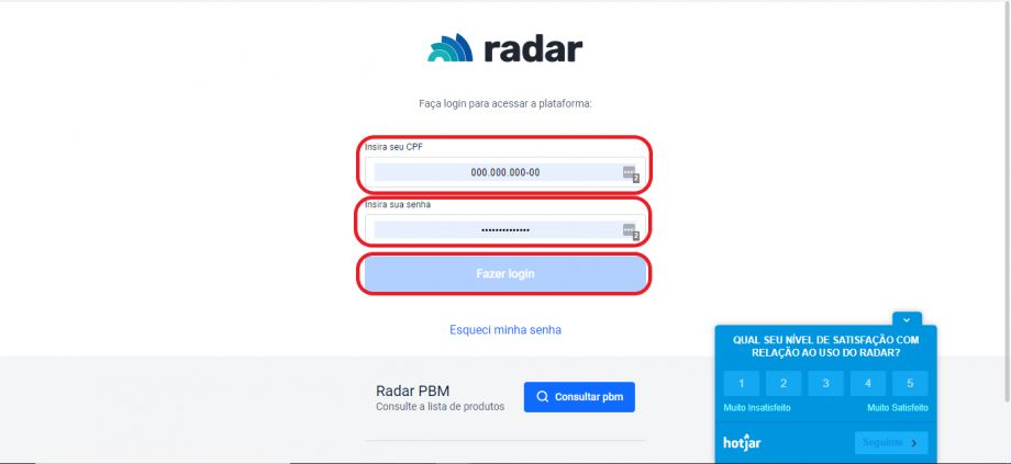 Para cadastrar novos usuários no Radar, acesse com seu CPF e sua senha e clique em “Fazer login”.
