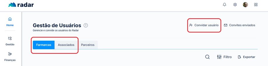 Tanto para colaboradores Farmarcas, quanto para os colaboradores dos Associados o passo a passo é o mesmo, sendo assim, basta clicar na aba em que quer adicionar este colaborador “Farmarcas ou Associados” e em seguida clicar em “Convidar Usuário”.