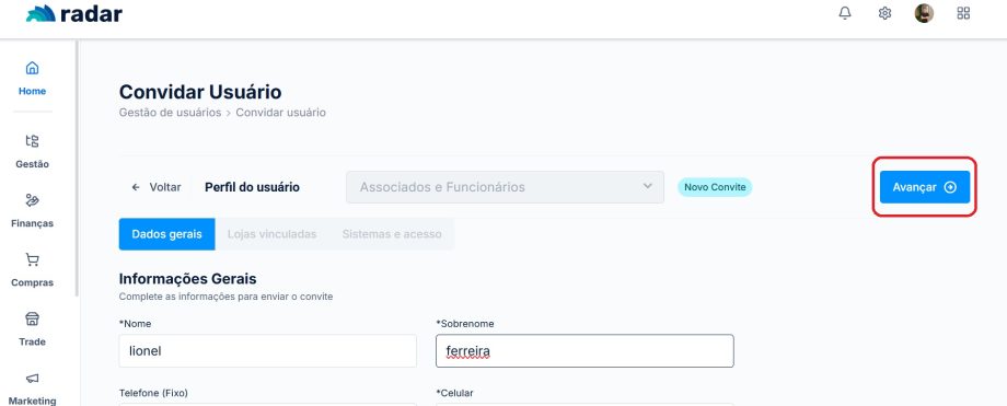 Preencha os campos obrigatórios com os dados gerais do colaborador e clique em “Avançar”.
