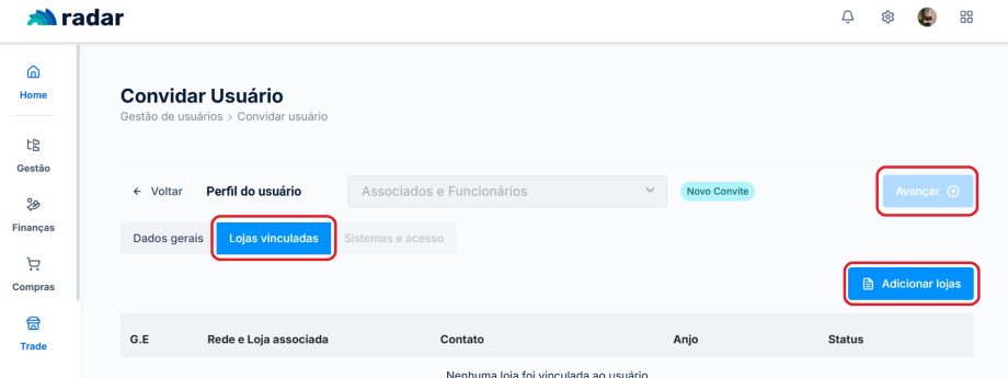 Caso for colaborador do associado, terá que incluir em “Lojas Vinculadas” e na aba “Adicionar Lojas” colocar as lojas que ele ficará responsável e clicar em “Avançar”.
