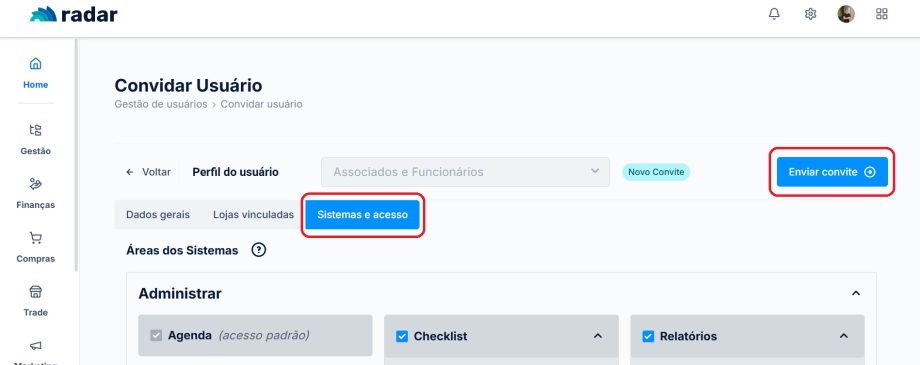 Por fim, preencha em “Sistemas e acessos” os campos que o colaborador poderá ter acesso, após, clique em “Enviar convite”.