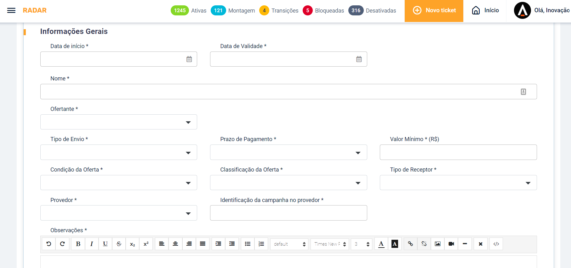 Em observações deve ser utilizada para inserir as regras da oferta ou outras especificações que não são preenchidas nos demais campos obrigatórios.
