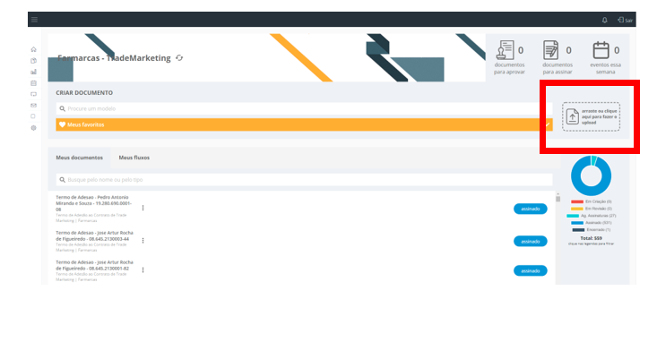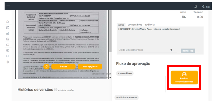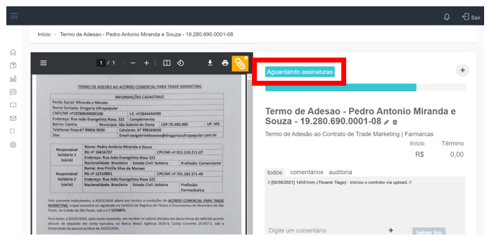 O Status do documento, ficará como “Aguardando assinatura” até que ambas as partes assinem o documento.