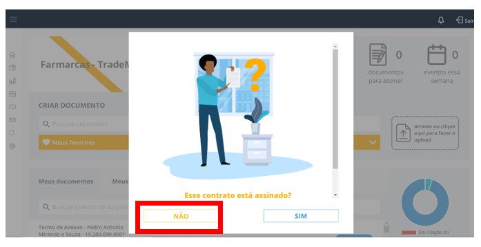 Depois de fazer o upload do arquivo aparecerá a mensagem: “Esse contrato está assinado? clicar em “Não. (mesmo que o arquivo esteja assinado pelo associado é necessário solicitar a assinatura do gerente do departamento de Trade Marketing).