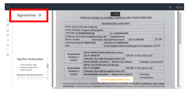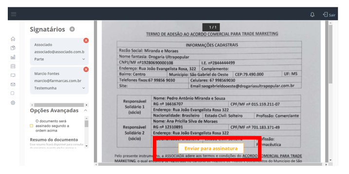 Os e-mails irão aparecer ao lado, confirmar se estão todos corretos e clicar em “Enviar para assinatura”.