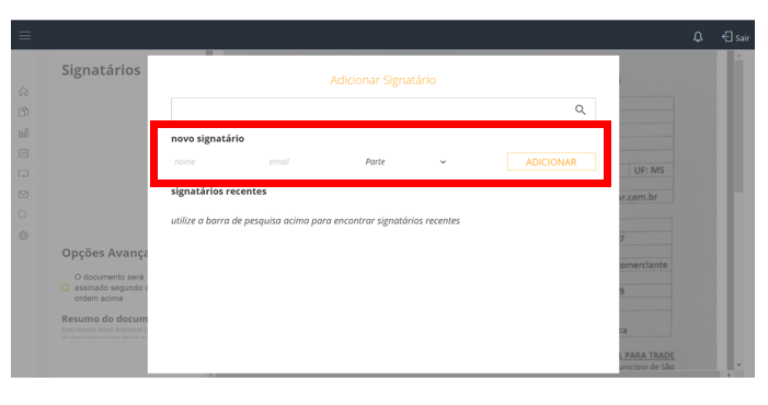 Clicar no “Signatários para adicionar os dados de quem irá assinar: