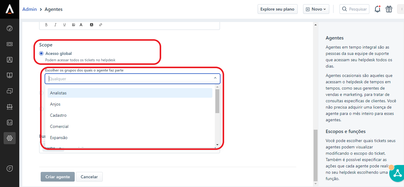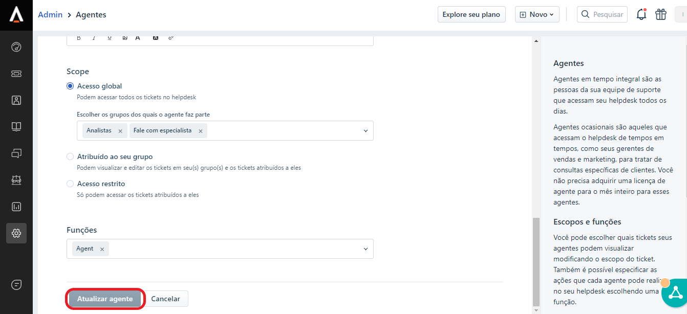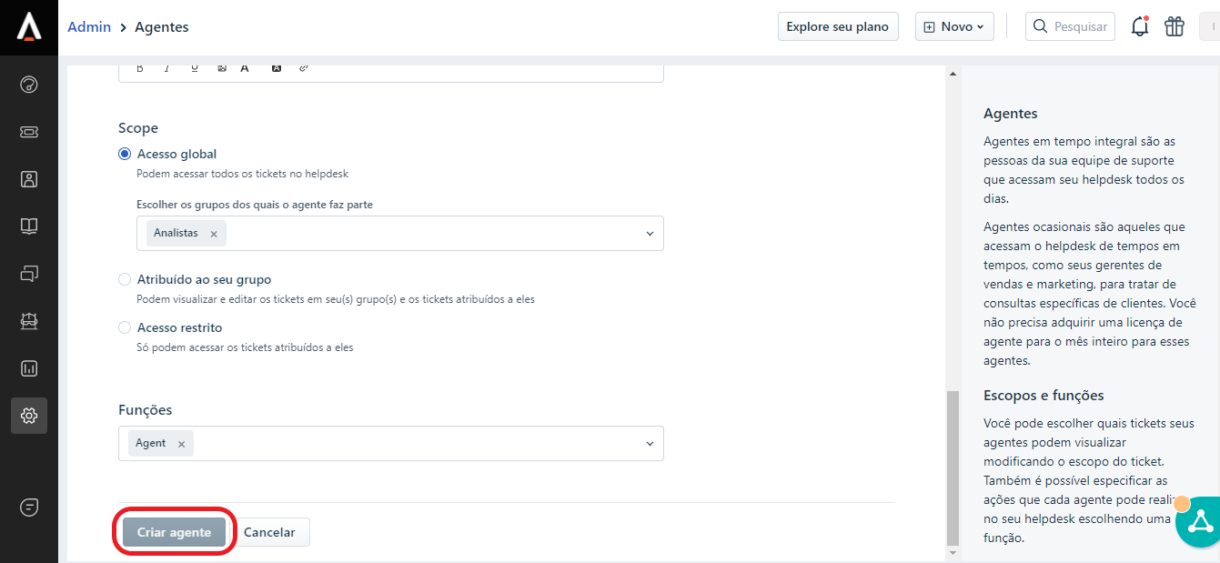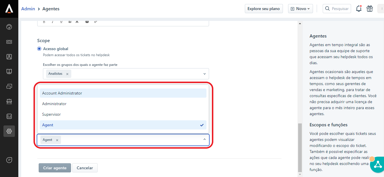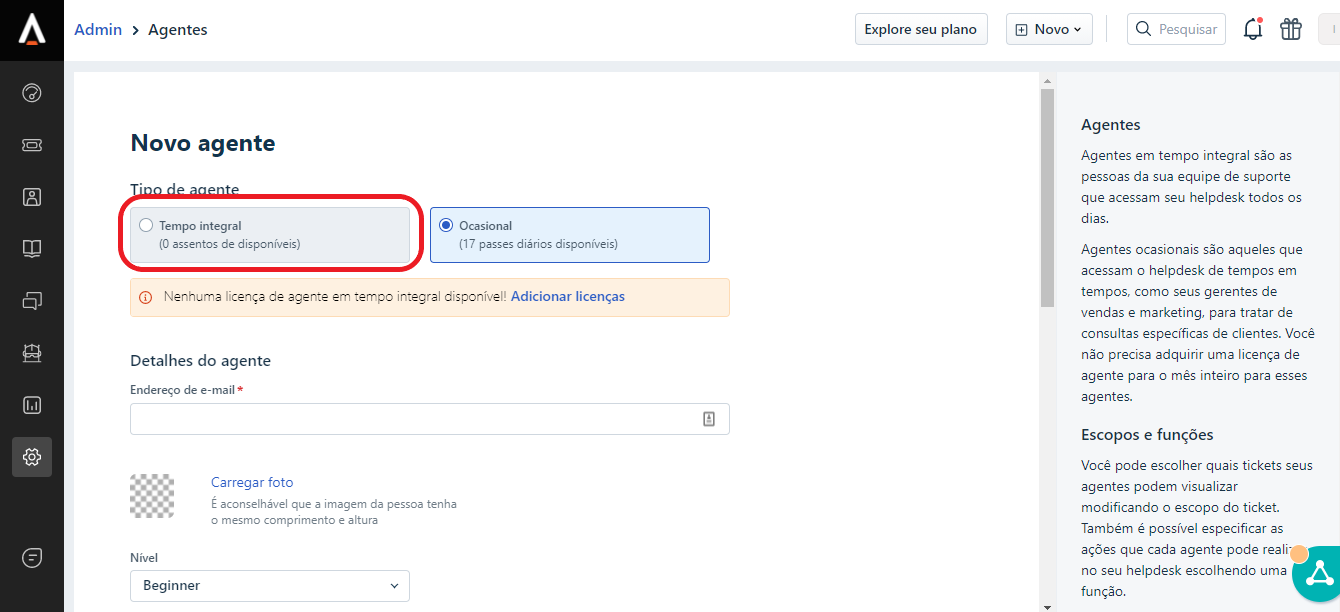 O tipo de agente “Ocasional” é uma liberação de apenas 1 dia de utilização do Freshdesk.