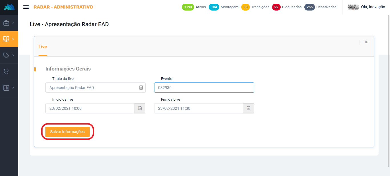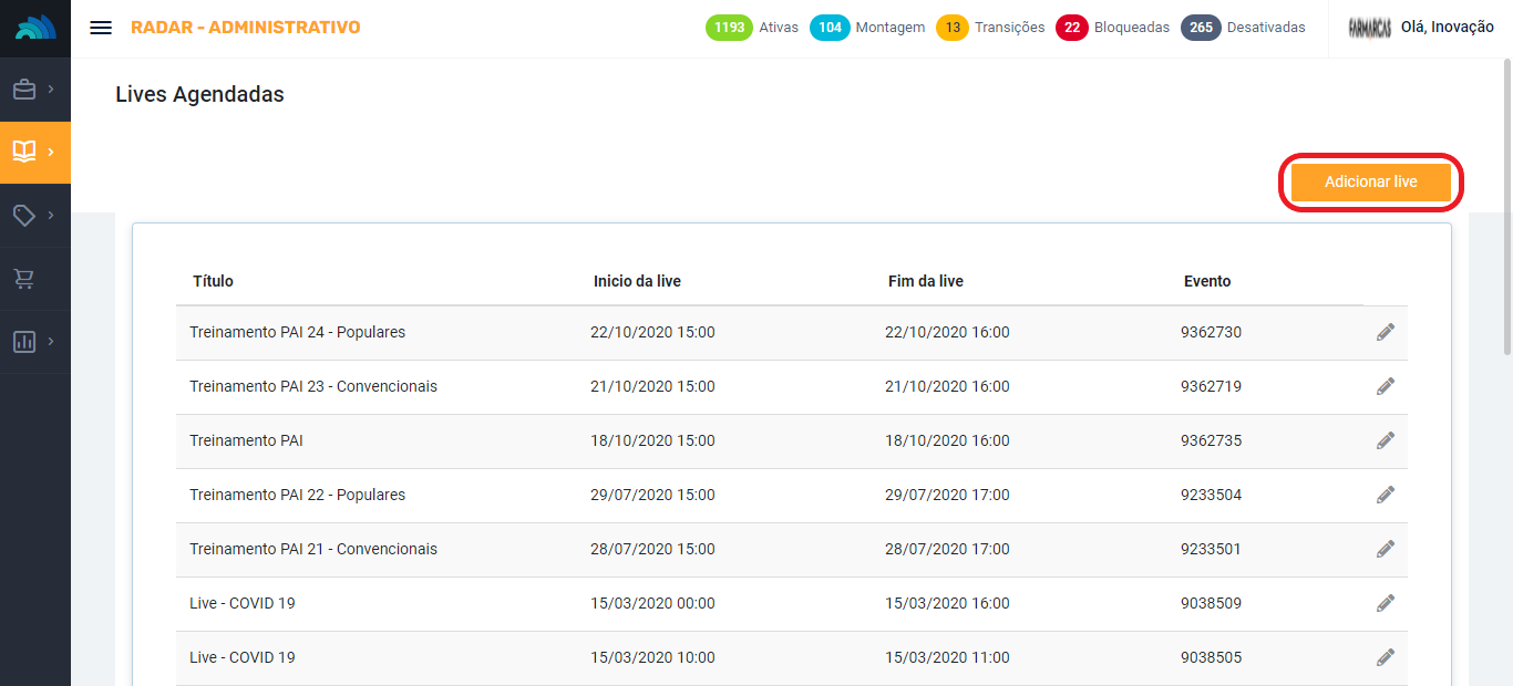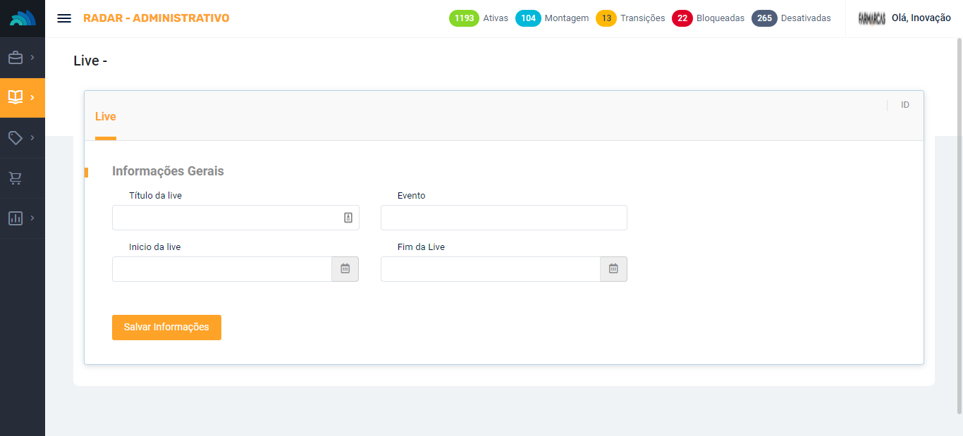Uma das tarefas no processo de Gestão de lives, é realizar o cadastro dos dados da live no Radar.