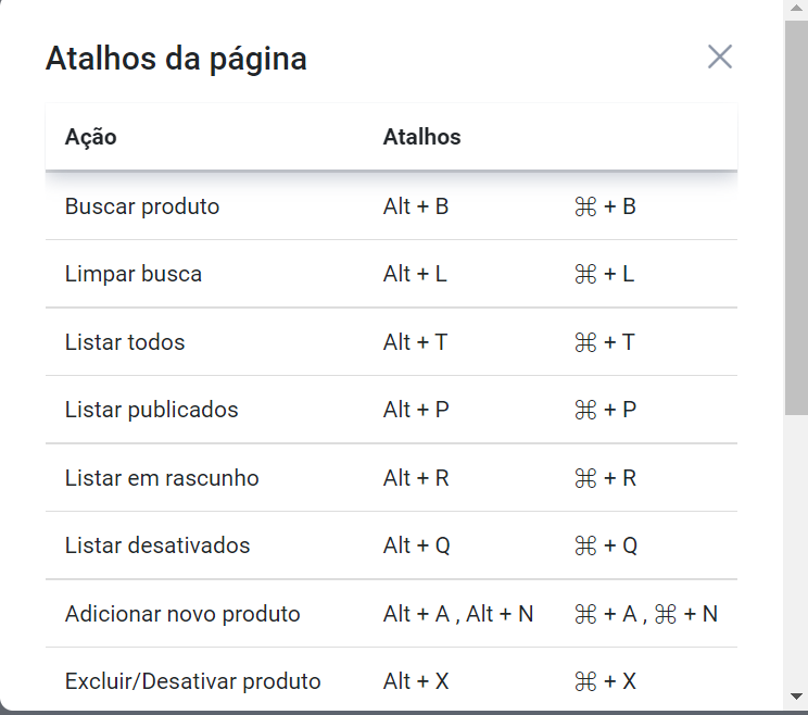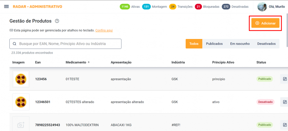 - Todos – consulte de uma forma geral todos os produtos com status de Publicados, Em rascunhos e Desativados