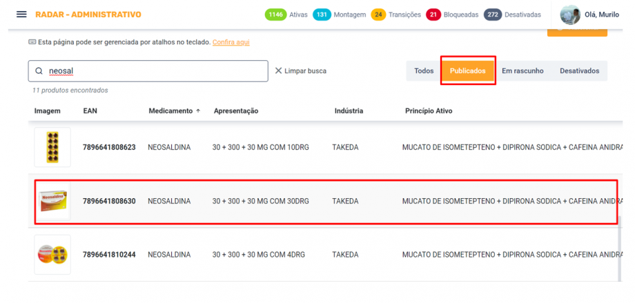 - No campo de busca, é possível pesquisar o produto pelo Ean, Nome do produto, princípio ativo ou pelo nome da indústria.
