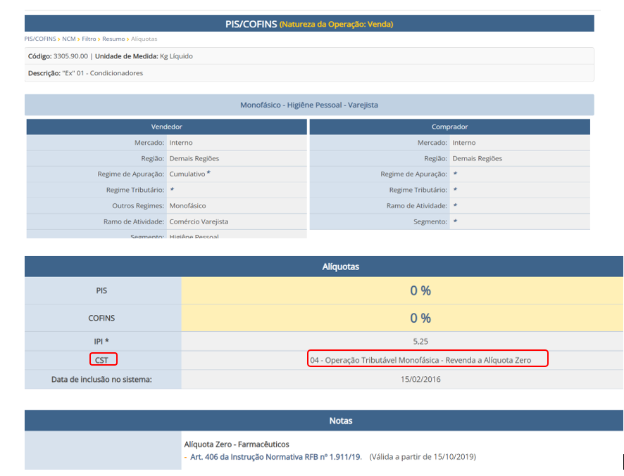 Onde teremos a informação do CST correspondente ao PIS/COFINS do produto pesquisado.