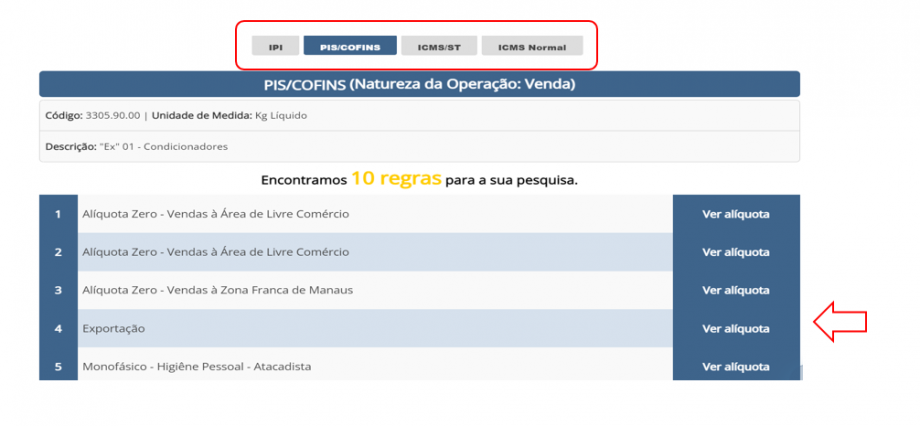 Após analisar a regra correta que se enquadra no produto, clicar em ver alíquota: