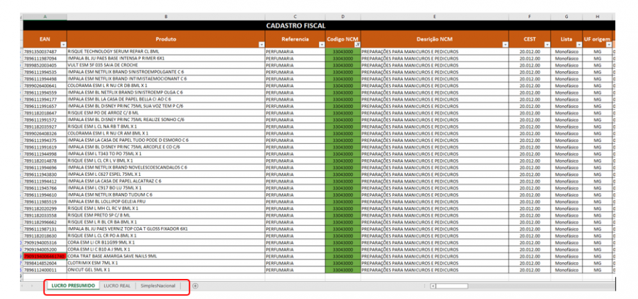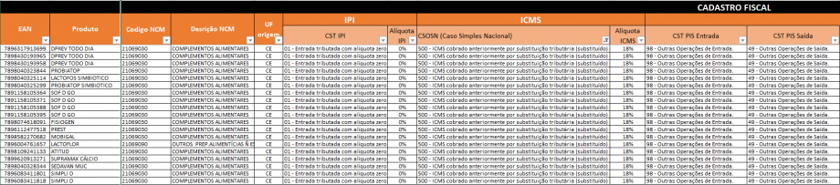 Código NCM, Descrição NCM, CEST, Lista, UF Origem, CST IPI, Alíquota IPI, Totalizador Fiscal, CST ICMS, Alíquota ICMS, CST PIS Entrada, CST PIS Saída, CST COFINS Entrada, CST COFINS Saída e a Natureza da Receita.