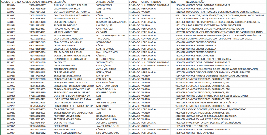 Extraímos as informações: Código interno, EAN, Descrição Produto, Referência, NCM e descrição do NCM.