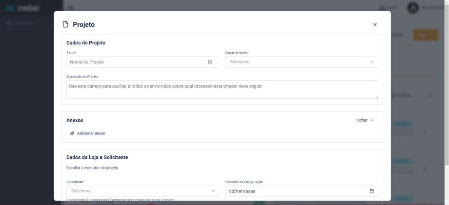 A área de projetos foi criada para facilitar o acompanhamento dos projetos das lojas e dar uma visibilidade maior para os times internos e nossos associados.
