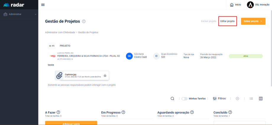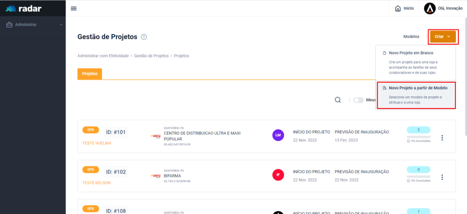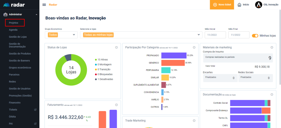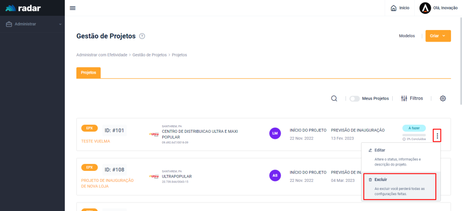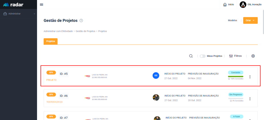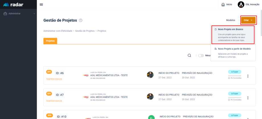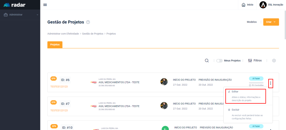 Acesse o menu lateral do Radar e clique em “Administrar”, em seguida, acesse a aba “Projetos”