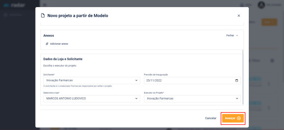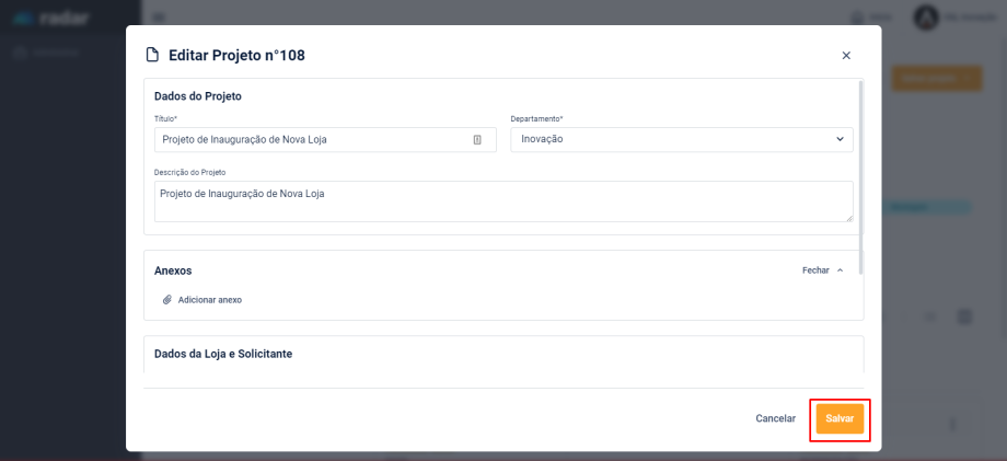 Lembrando que o Usuário deve ser o Solicitante do Projeto