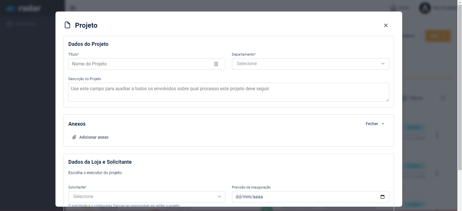 A área de projetos foi criada para facilitar o acompanhamento dos projetos das lojas e dar uma visibilidade maior para os times internos e nossos associados.