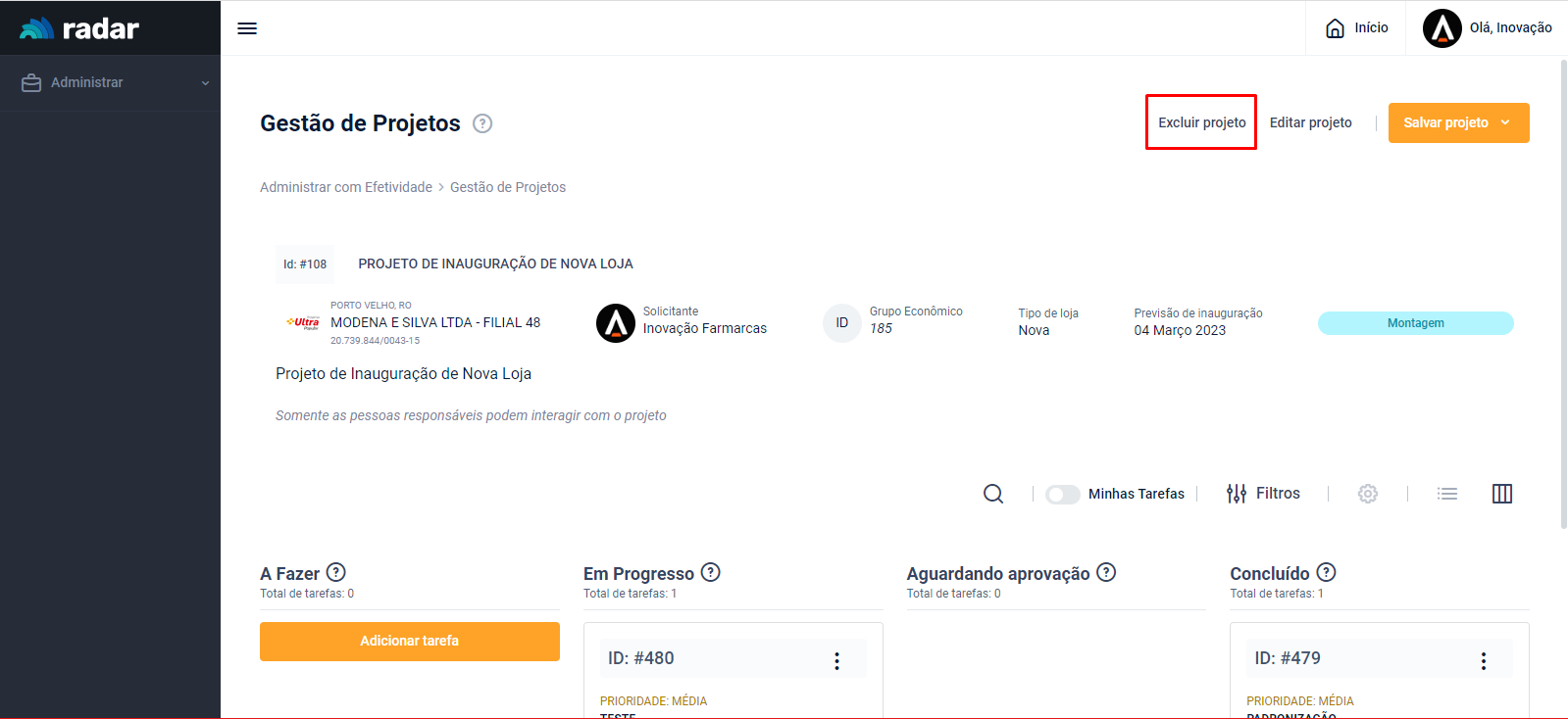 Acesse o menu lateral do Radar e clique em “Administrar”, em seguida, acesse a aba “Projetos”
