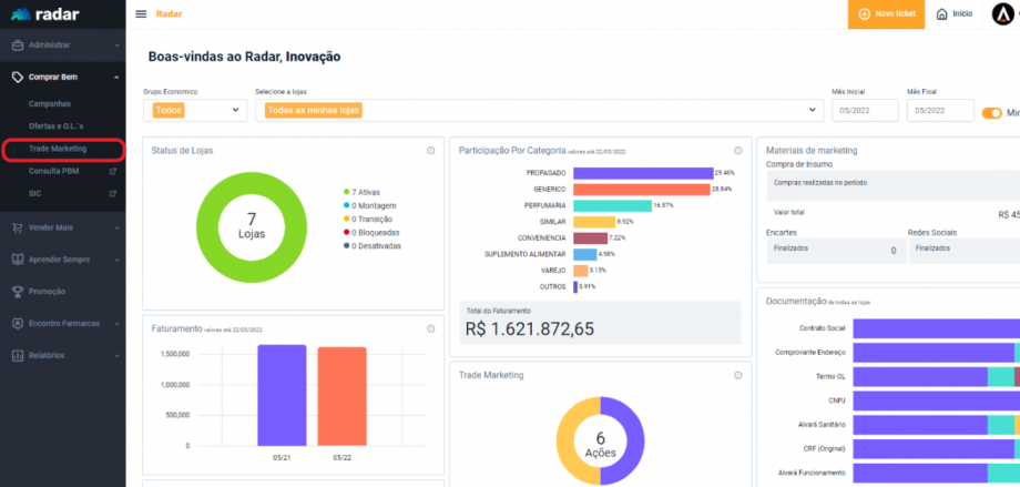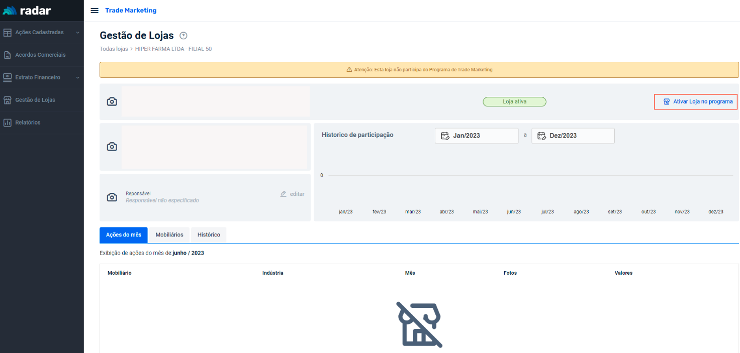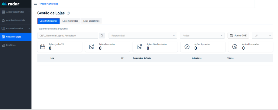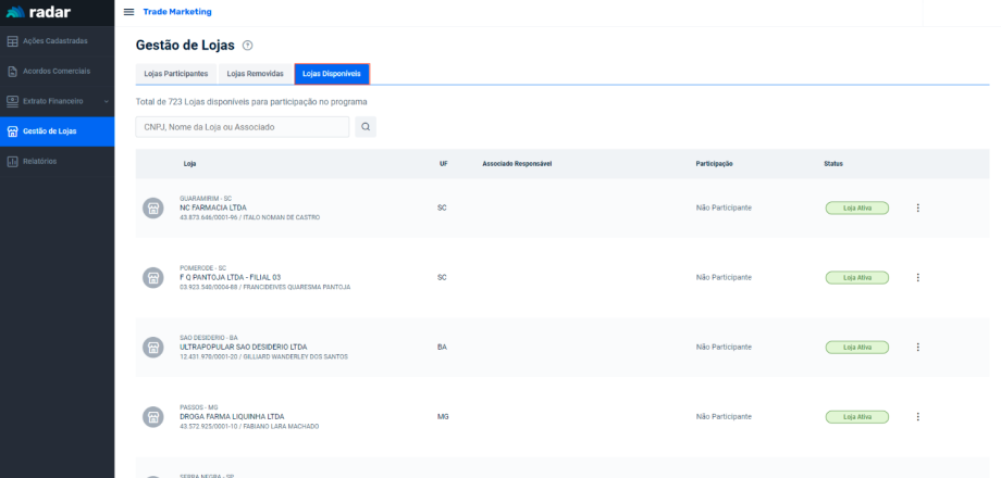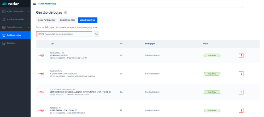 O processo de inclusão de lojas é um gerenciamento feito através do Radar, onde o time comercial pode realizar a inclusão e até a exclusão de lojas do programa de trade marketing de acordo com a estratégia necessária para as lojas.