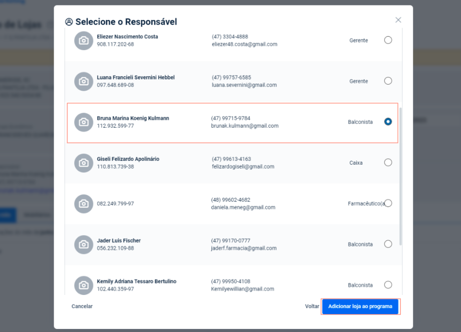 Inclua o Responsável e em seguida clique em Adicionar loja ao programa