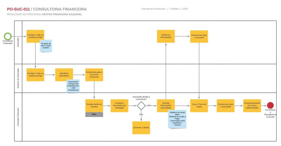 O Consultor Financeiro após receber a tarefa do analista, ele faz o primeiro contato com a loja para entender o cenário atual, caso o associado queira dar andamento ao suporte de consultoria, é solicitado todas as informações necessárias para que a analise seja feita.