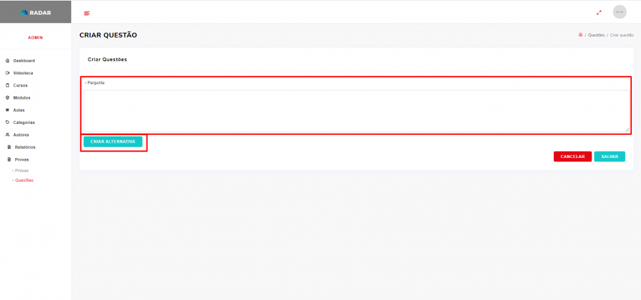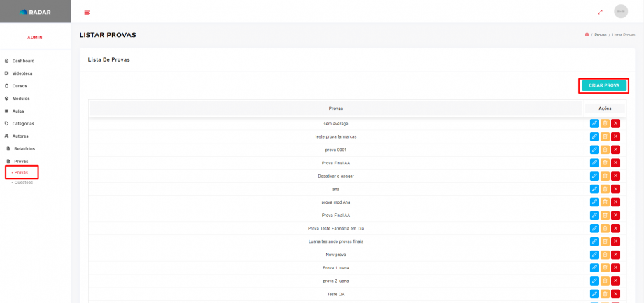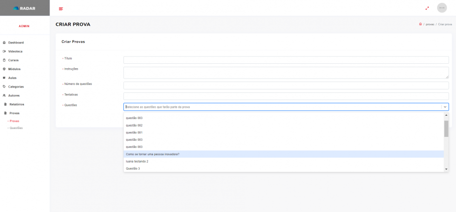 Após criar as questões, clique em “Provas” e em seguida em criar “Criar questões”