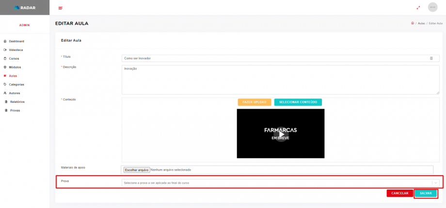 Com a prova criada, deve ser inserida dentro da aula pertencente ao curso que será certificado.