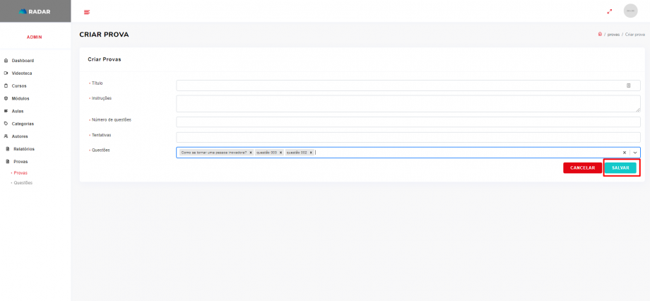 Após preencher todos os campos e inserir as questões, clique em “Salvar”