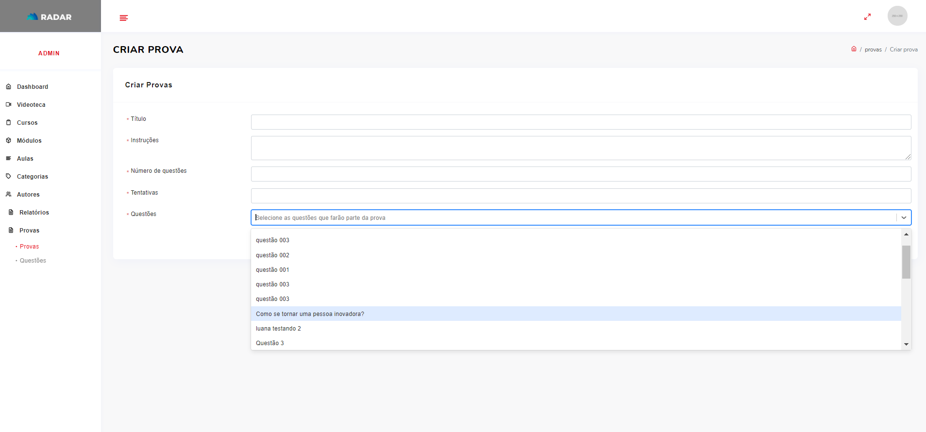 Após criar as questões, clique em “Provas” e em seguida em criar “Criar questões”