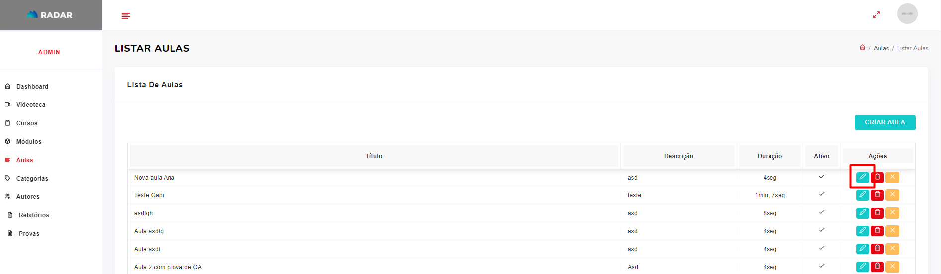 Clique em “Aulas” e clique no ícone de lápis na linha da aula que você deseja inserir a prova criada